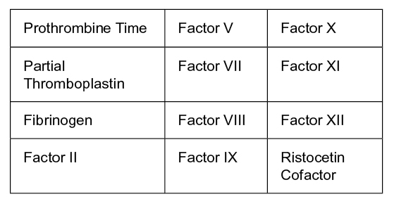 PT, aPTT, Fibrinogen, Thrombin Clotting Time, Factor Assays
