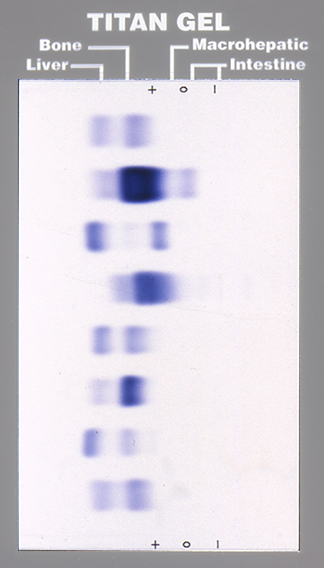 The TITAN GEL high resolution agarose electrophoresis method for separation of alkaline phosphatase isoenzymes provides excellent resolution. Neuraminidase is used to enhance separation of bone and liver fractions. A unique additive to the gel matrix ensures separation of the macrohepatic fraction from bone and liver. The excellent sensitivity of the system allows detection and separation of ALP isoenzymes even in samples with low activity. Up to eight samples may be applied per gel.