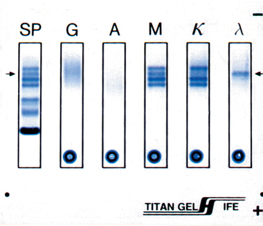 Immunofixation electrophoresis (IFE) is characterized by its enhanced sensitivity, ease of interpretation, quick test results, and excellent resolution. IFE is a two stage procedure using agarose protein electrophoresis first, then immuno-precipitation. The specimen may be serum, urine or CSF. There are many applications for IFE but the primary use is characterization of paraproteins. Pre-cut wells on each antisera lane allow use of TITAN GEL ImmunoFix Controls to provide verification of antisera reactivity on each patient gel.
