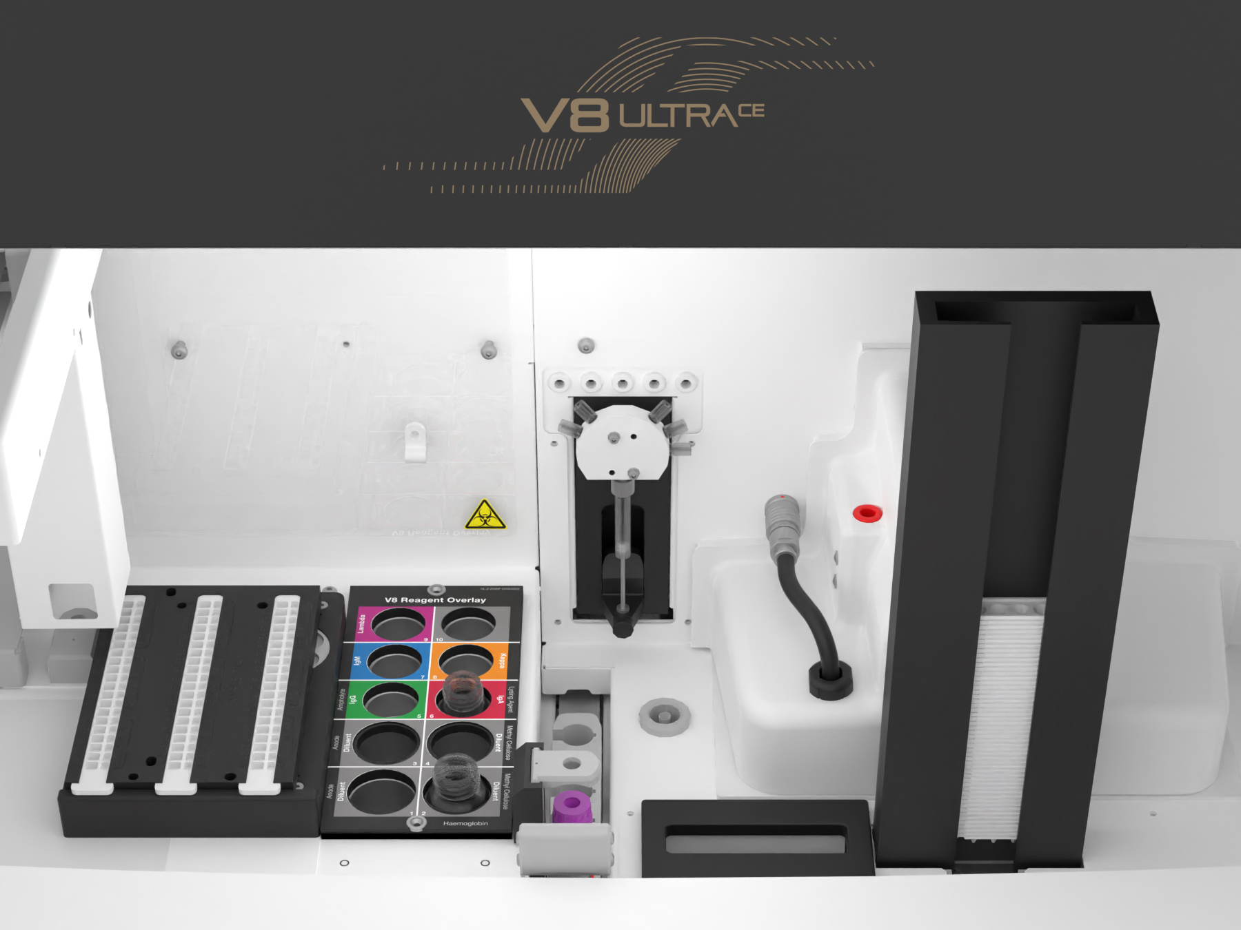 The V8 UltraCE new features include integrated cap-piercing technology and a full needle-wash mechanism that helps prevent cross-contamination.
